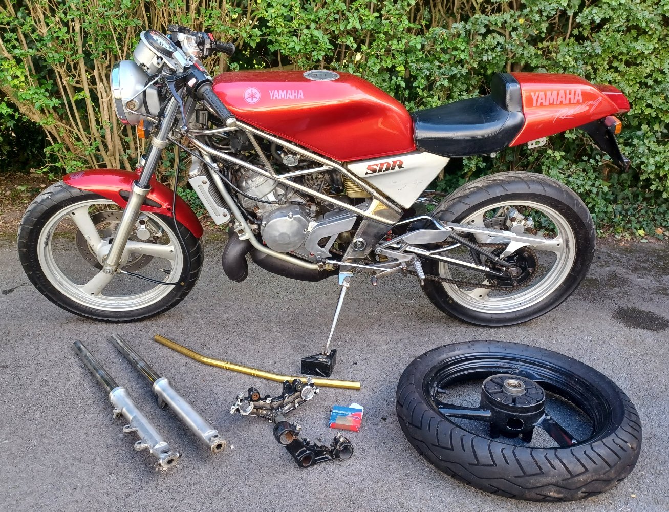 I let the MOT expire on the SDR because it needed a few things sorting out. In October I let the same bloke that had worked on the TZR take it away - he gave me it back with a brand-new rear-shock (aftermarket Aprilia AF1 125), new fork seals and oil, stripped and cleaned calipers and new front brake pads. He also pulled the dent out of the silencer and painted it, and fitted a new subframe so that the seat fastens and locks properly now.